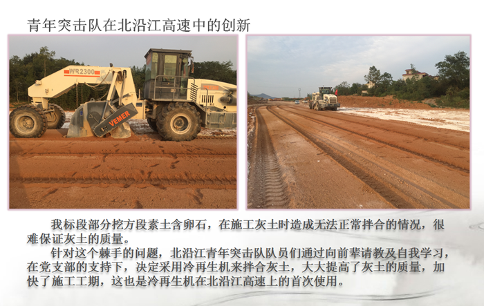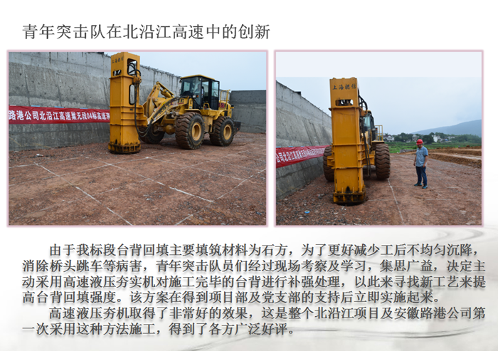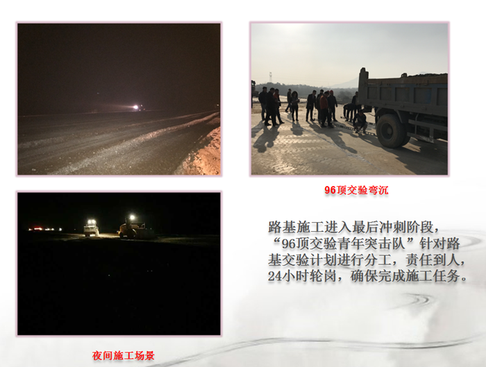 在工程建設中,該青年突擊隊圍繞“急、難、新、險、重”的任務開展了一系列活動。一是成立“96頂交驗青年突擊隊”,針對路基交驗計劃進行分工,責任到人,24小時輪崗,加快了施工進度;二是立足崗位,創新創效,采用高速液壓夯實機的創新工藝對臺背回填質量進行補強,采用冷再生機拌合灰土提高灰土質量,加快施工工期;三是規范要求,精細交底保安全,組織開展各類質量安全文明進班組和質量安全自查自糾活動,對施工人員進行了現場工序施工可視化技術交底,切實提高職工質量安全意識,青年職工的智慧在青年文明號創建過程中得以彰顯和應用。