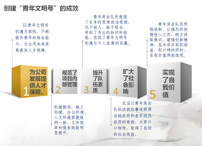 爭創活動中,主要圍繞8個方面開展工作。一是建立以突擊隊隊長為負責人的創建領導小組,定期組織上團課,加強隊員思想教育;二是開展“我為重點工程獻青春”為主題的勞動競賽活動,激發團員青年的拼搏奉獻精神;三是建立健全創建檔案,做好資料留存;四是以服務青年為中心,以提高工作質量和效率為重點,創新工作模式;五是做好“師帶徒”,抓好“傳、幫、帶”, 設定青年人才培養目標,促進青年崗位成才;六是成立青年志愿者服務隊,開展志愿幫扶;七是建立青年安全監督崗,助力安全生產;八是結合項目實際,組織開展文體活動。
