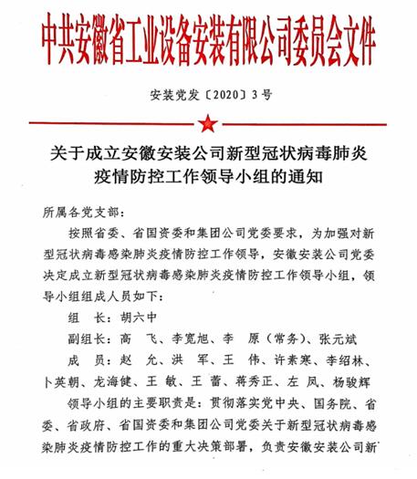 一是組織到位。1月26日,安徽安裝公司下發(fā)《關(guān)于成立新型冠狀病毒感染肺炎疫情防控工作領(lǐng)導(dǎo)小組的通知》,負(fù)責(zé)貫徹落實(shí)上級關(guān)于新型冠狀病毒感染肺炎疫情防控工作的重大決策部署,負(fù)責(zé)安徽安裝公司新型冠狀病毒感染肺炎疫情防控工作的領(lǐng)導(dǎo),研究解決安徽安裝公司疫情防控中的重大問題,統(tǒng)籌組織防控處置。