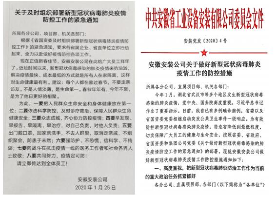 二是部署到位。疫情防控工作開展后,1月25日(大年初一)安徽安裝公司發(fā)出防控疫情工作的緊急通知,1月27日制定肺炎疫情防控措施,對疫情防控工作進(jìn)行細(xì)化安排,周密部署。要求各分公司、直屬項(xiàng)目部、各部門要以對職工群眾生命安全高度負(fù)責(zé)的態(tài)度,精準(zhǔn)施策,堅(jiān)決遏制疫情在安徽安裝公司輸入、蔓延,鼓勵職工戴口罩、勤洗手、多通風(fēng)、少走動、常消毒。