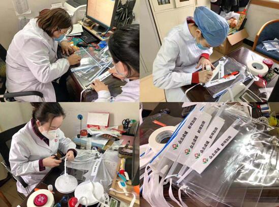 在醫院部分防護物資短缺的情況下,為了加強醫護人員的自身防護,降低被感染的概率,青年突擊隊成員們共同努力出謀劃策,利用文件袋、透明塑料薄膜制作成防護面罩,有效地緩解了防護用品短缺的難題。