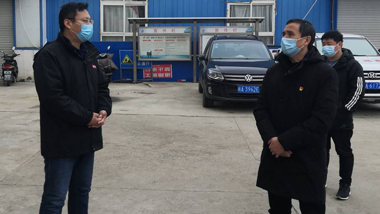 2月14日上午,固鎮縣住建局局長陳大鵬赴安建建設公司第四工管部檢查指導疫情防控工作,第四工管部負責人盧朋陪同。