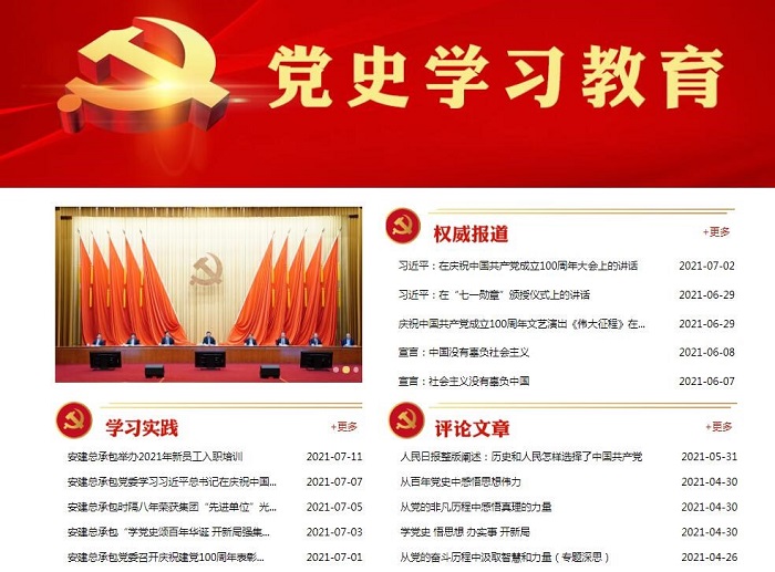增設學習專欄。在公司門戶網站設置“黨史學習教育”板塊,動態發布人民網、新華網等主流媒體權威報道、評論文章和公司黨史學習教育活動有關新聞報道;公司微信公眾號堅持每日發布“黨史百年天天讀”;統籌集團年度工作會和職代會以及公司職代會精神宣貫,統一制作、在辦公區域和所屬項目駐地擺放宣傳展板,懸掛宣傳橫幅;開展“節日里的黨史教育”,發布“致敬堅守崗位的勞動者”等專題報道