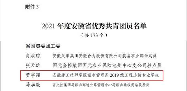 奮斗的青春最美麗——安徽建工技師學院黃宇翔同學榮獲 “安徽省優秀共青團員”稱號