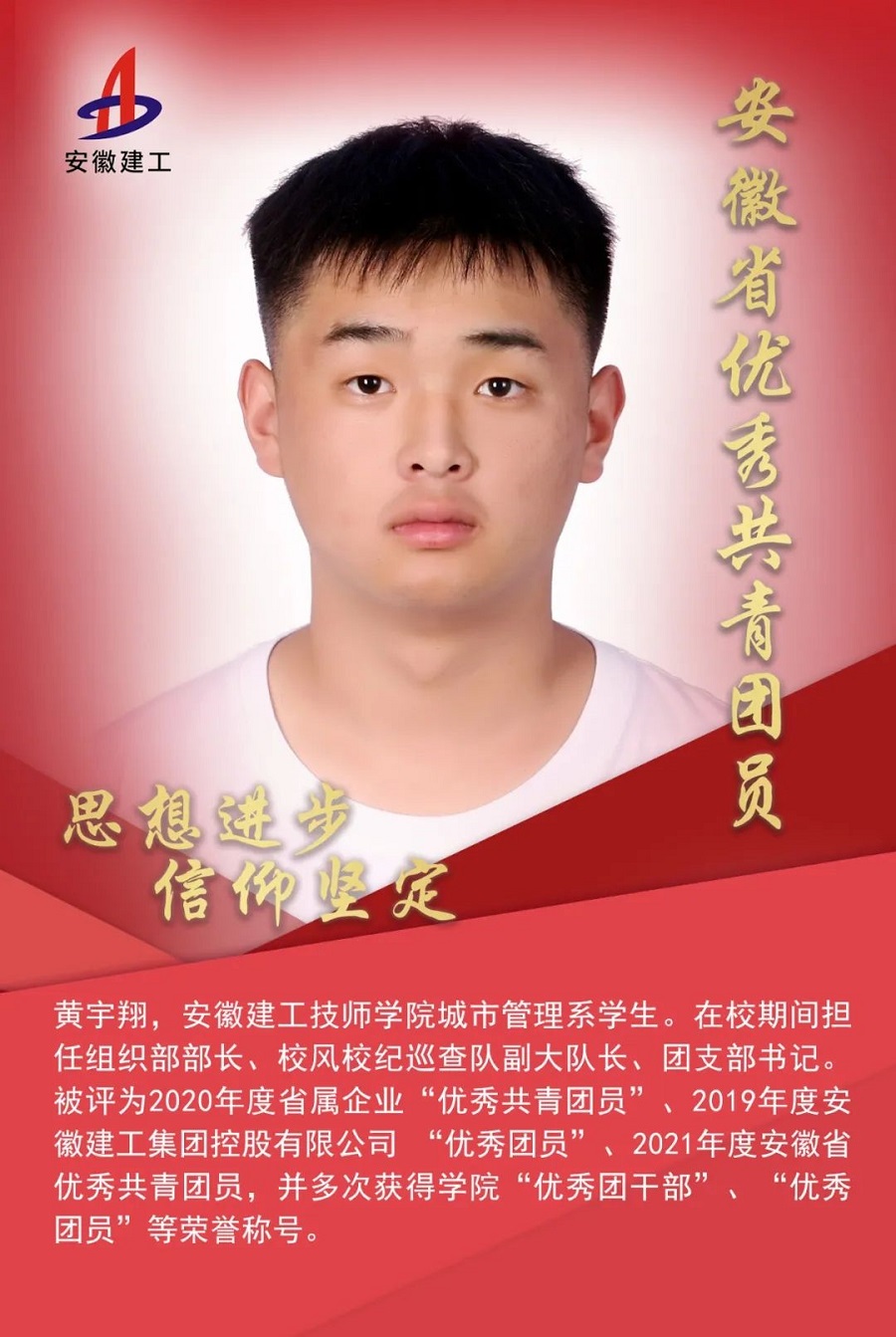 黃宇翔,男,漢族,2002年7月出生,共青團員,安徽建工技師學院城市管理系學生。在校期間擔任安徽建工技師學院城市管理系團總支組織部部長、校風校紀巡查隊副大隊長、團支部書記。被評為2020年度省屬企業“優秀共青團員”、2019年度安徽建工集團控股有限公司“優秀團員”,并多次獲得學院“優秀團干部”、“優秀團員”等榮譽稱號、獲校級二等獎學金和工程算量技能大賽優勝獎。黃宇翔同學多次主動參加新冠肺炎疫情防控工作,并積極參與2021年7月河南洪水的志愿救助工作,表現突出,志愿服務時數更是達到了近400小時。在同學眼中他是熱愛生活、積極向上的好朋友,在長輩眼中,他是艱苦樸素、勤奮孝順的好孩子,在老師眼中他是認真工作、熱愛學習的好學生,更是廣大團員青年的好榜樣。