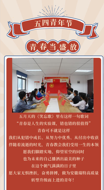 在五四青年節(jié)來臨之際,安徽瑞特團(tuán)支部組織觀看《電影黨課:五四精神》微視頻,點(diǎn)燃青年職工愛國熱情;通過召開五四青年職工在專題座談會(huì)面對(duì)面交流分享建團(tuán)百年心得感悟、重溫入團(tuán)誓詞、與團(tuán)旗合影,進(jìn)一步筑牢愛國、愛企情懷;在五四青年節(jié)當(dāng)天,團(tuán)支部發(fā)出五四青春寄語,引導(dǎo)青年職工將五四精神融入青年奮斗,譜寫新時(shí)代華章,為公司高質(zhì)量轉(zhuǎn)型升級(jí)貢獻(xiàn)青年力量。
