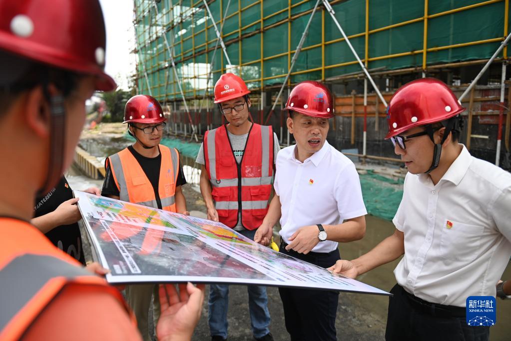 在浙江省寧波市奉化區(qū)蕭王廟街道滕頭村,二十大代表、滕頭村黨委書記、村委會主任傅平均(右二)在村黨群服務(wù)中心大樓建設(shè)工地察看施工進(jìn)展(2022年9月16日攝)。新華社記者 黃宗治 攝