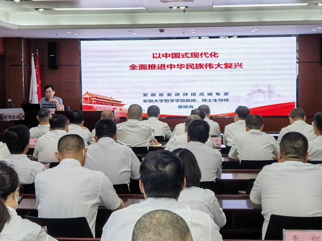 培訓邀請到安徽省委宣講團高端專家,安徽大學哲學學院教授、博士生導師裴德海進行授課。裴教授通過《以中國式現代化全面推進中華民族偉大復興》這一主題,系統闡釋了什么是“中國式現代化”、“中國式現代化”的本質要求、“中國式現代化”理論背景和依據、“中國式現代化”總體戰略安排、實現“中國式現代化”必須牢牢把握的準則等內容,梳理了中國式現代化的發展脈絡,幫助大家理解和學習了中國式現代化的深刻內涵及重大意義。廣大學員紛紛表示,作為黨員領導干部,要在黨的領導下,始終保持“闖”的精神、“創”的勁頭、“干”的作風,堅定信念,踏實工作,自覺肩負起建設中國特色社會主義現代化強國的歷史使命,為開創公司高質量發展新局面凝聚磅礴力量。