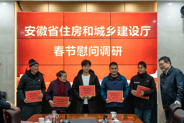 在新春佳節即將到來之際,1月28日下午,省住建廳黨組書記、廳長賀懋燮一行來到安徽建工集團所屬安徽三建公司走訪慰問困難職工并召開座談會,送來廳黨組的關心關懷。廳黨組成員、副廳長吳桂和,廳黨組成員、副廳長陳揚年,廳黨組成員、總工方廷勇,建工控股黨委副書記、總經理劉家靜,黨委委員、紀委書記、監察專員王汪苗陪同慰問。