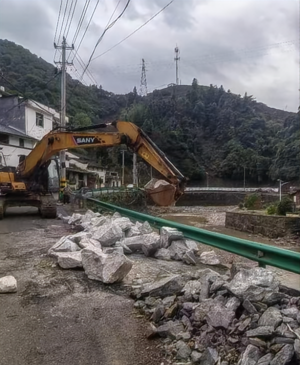 6月22日上午,救援隊緊急趕往下一個受災嚴重的區域——黃山徽州區富溪鄉光明村,碣石村、富溪村、福州村,展開應急搶險救助;應急搶險隊包括50名員工,其中9名黨員,三臺大型挖機設備,兩臺大型鏟運車,開展對富溪鄉范圍內四個村寨受災居民房屋、河道內洪水淤積泥沙清理;對046縣道長塢段沿河道邊坡坍塌組裝鋼筋籠拋石護坡,對山體滑坡碎石、山體滑坡致受阻道路泥漿清理等搶險工作。