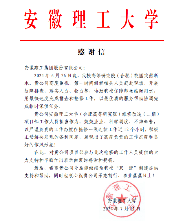近日,安徽建科總承包分院收到安徽理工大學感謝信,對安徽理工大學(合肥高等研究院)維修改造(二期)項目部在校園夜間突發斷水搶修過程中提供的大力支持和辛勤付出表示感謝。