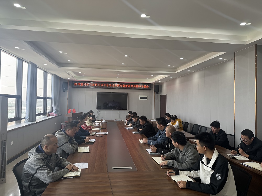 蚌埠建材組織召開學習傳達習近平總書記考察安徽重要講話精神專題會,公司領導班子、中層副職及以上管理人員、部分黨員和青年團員代表參加會議。會議要求,各中心、各站點要以學習習近平總書記在安徽考察時的重要講話精神為契機,將習近平總書記的講話精神轉化為實干擔當的強大動力,堅持目標不變、任務不減,迎難而上,奮發奮進,為完成全年目標任務而努力奮斗。
