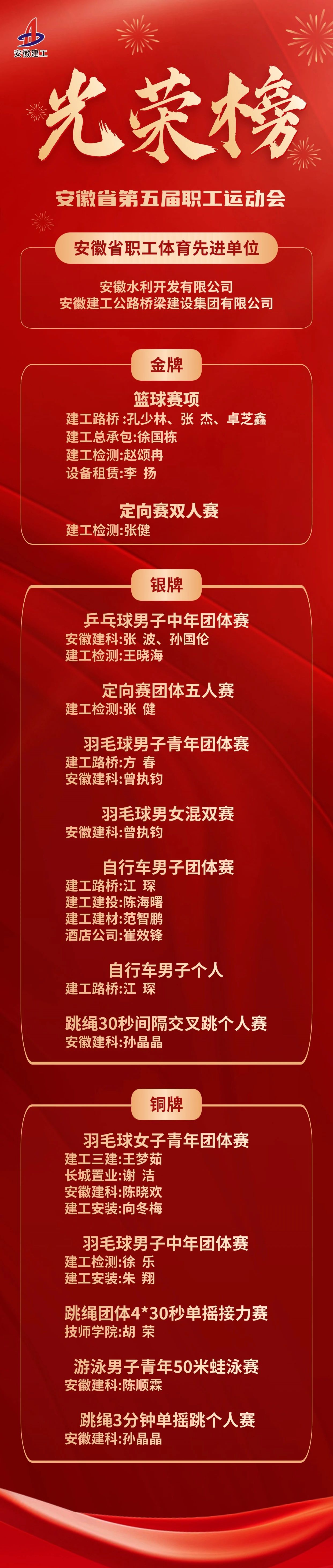 在全省職工運動競技場上,建工健兒以積極向上、團結奮進的精神風貌,集中展示了安徽建工“特別能吃苦、特別能戰斗”的企業作風和“奮發有為、勇爭一流”的國企活力風采。下一步,集團各級工會組織將緊緊圍繞全面深化改革目標任務,廣泛開展文化娛樂、體育健身、讀書學習、交友聯誼等多種形式的群眾性文體活動,讓“誠信、執行、工匠文化”等具有安徽建工特色的企業文化符號更加的深入人心,為集團轉型發展、高質量發展、大發展注入源源不竭的精神動力。