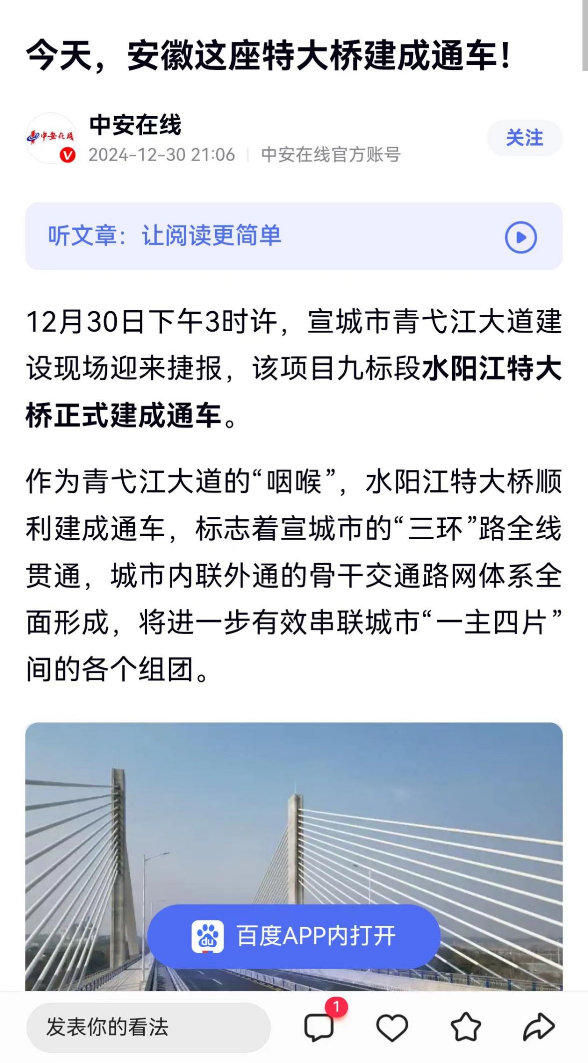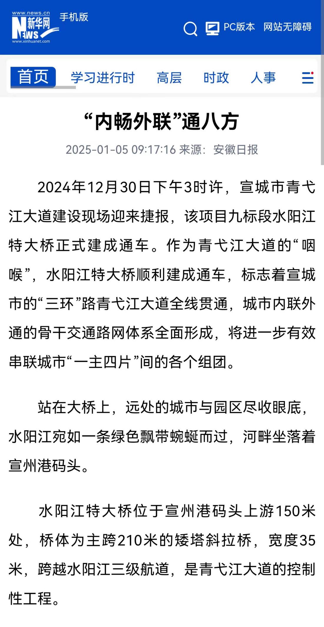 近日,建工路港承建的宣城市青弋江大道水陽江特大橋正式建成通車,受到安徽日報紙媒、新華網、中安在線等多個主流媒體關注報道。