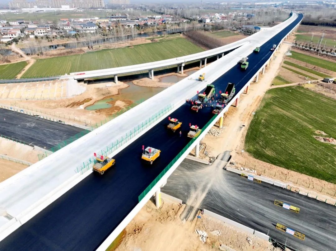 在徐淮阜高速淮北段,項(xiàng)目錨定7月通車(chē)目標(biāo),堅(jiān)持節(jié)假日施工“不斷檔”,順利完成全線水穩(wěn)攤鋪施工,正加速推進(jìn)瀝青路面施工。