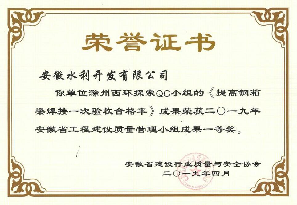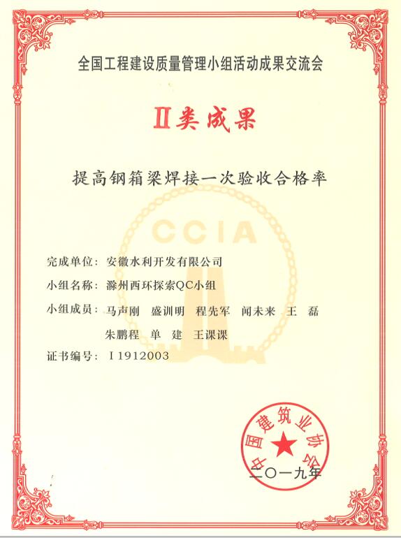 ACEG Hydro`s Chuzhou Xihuan QC Team has long practiced its concept of quality, participation and innovation, and continuously improved the welding quality of steel box girders and completed the QC achievement "To improve the one-time check and accept percent of pass rate of welded steel box-girders" in combination with the characteristics and the actual situations of all the projects and conducted repeated researches and analysis, formulated plans and measures to check the implementation effects, and before that, it won the first award of achievement for construction quality control team activities in Anhui Province and was recommended by Anhui Provincial Construction Quality and Safety Association to the National Construction Association