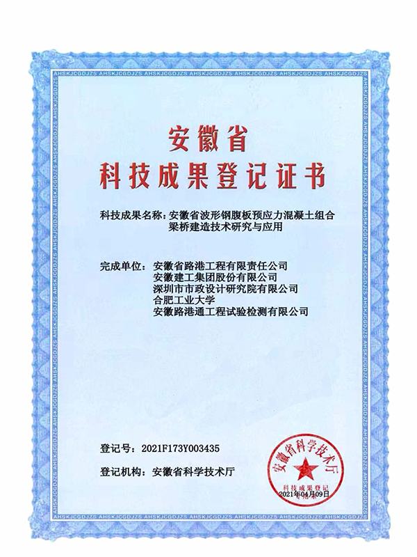 It is heartening to note from a recent media report that the Construction technology research and application of pre-stressed concrete composite girder bridge with corrugated steel webs – one of the scientific and technological achievements presented by ACEG Road and Port Construction Engineering Company Limited, one of ACEG’s subsidiaries, professional contractor for road and port construction and engineering, was issued with a registration certificate of sci-tech achievement by the relevant authority of Anhui provincial administration.